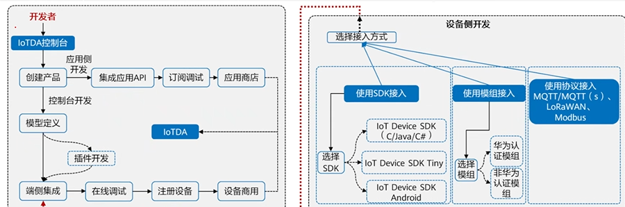 • 设备开发:主要为设备与物联网平台的集成对接开发,包括设备接入物联网平台、业务数据上报和对平台下发控制命令的处理