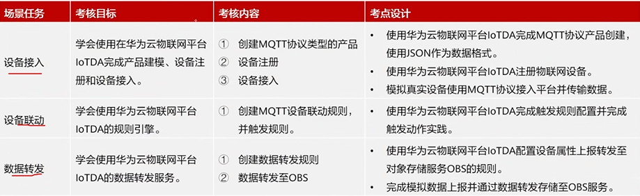 考试内容大致思路: 设置3大模块(设备接入华为云物联网平台IOTDA/设备联动/数据转发),每个模块设置N个任务,每个任务下设置N个考点。每个考点下面设置具体要求。
