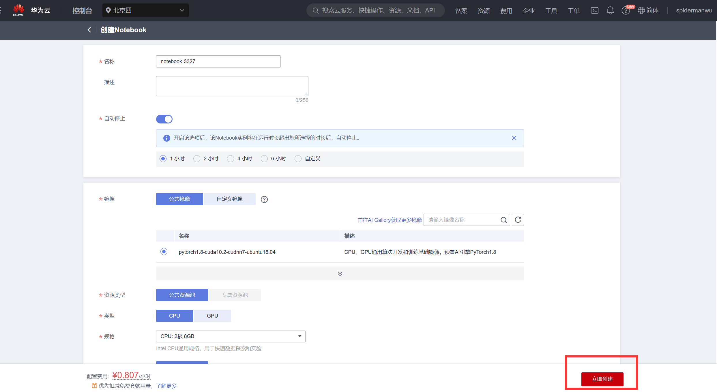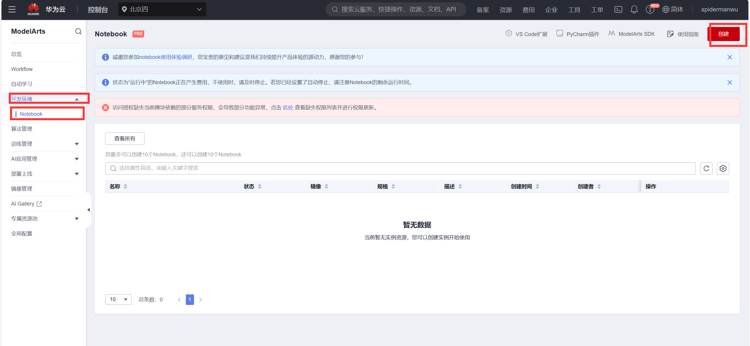 进入Modelarts控制台>点击开发环境> notebook,点击右上角创建