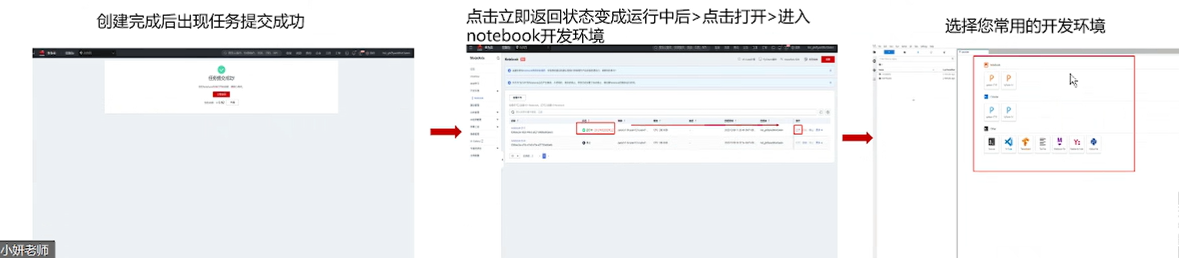 创建完成后出现任务提交成功,点击立即返回状态变成运行中后>点击打开>进入notebook开发环境,选择您常用的开发环境