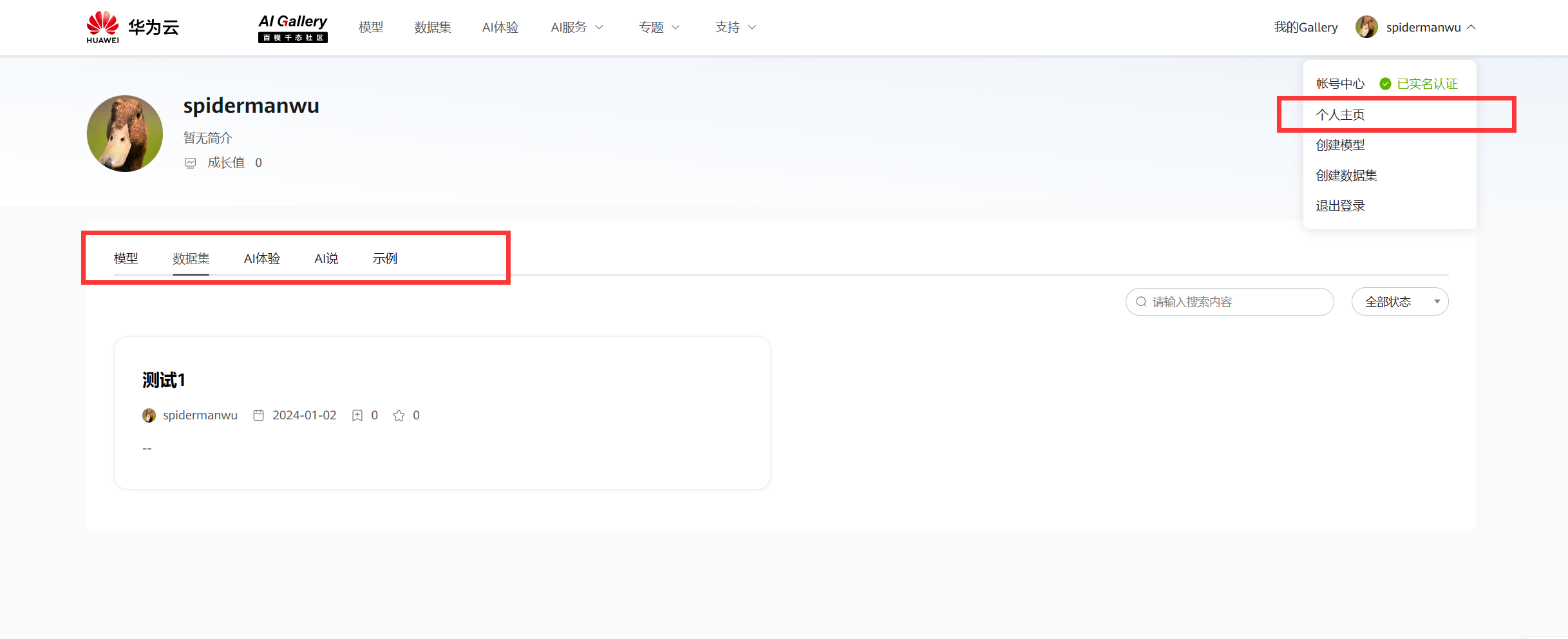 您在AlGallery发布资产后进入我的Gallery>个人主页>选择您发布的资产类型