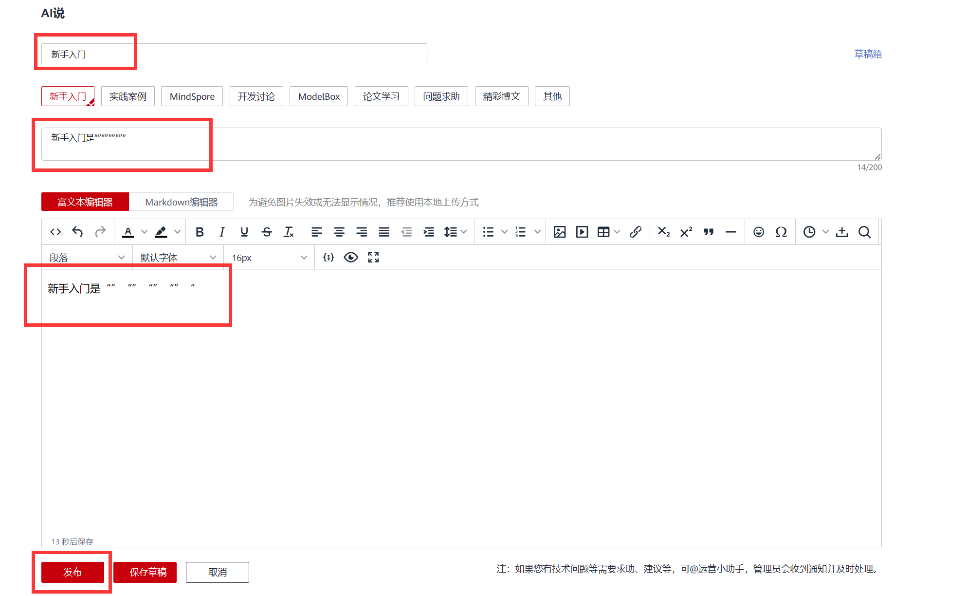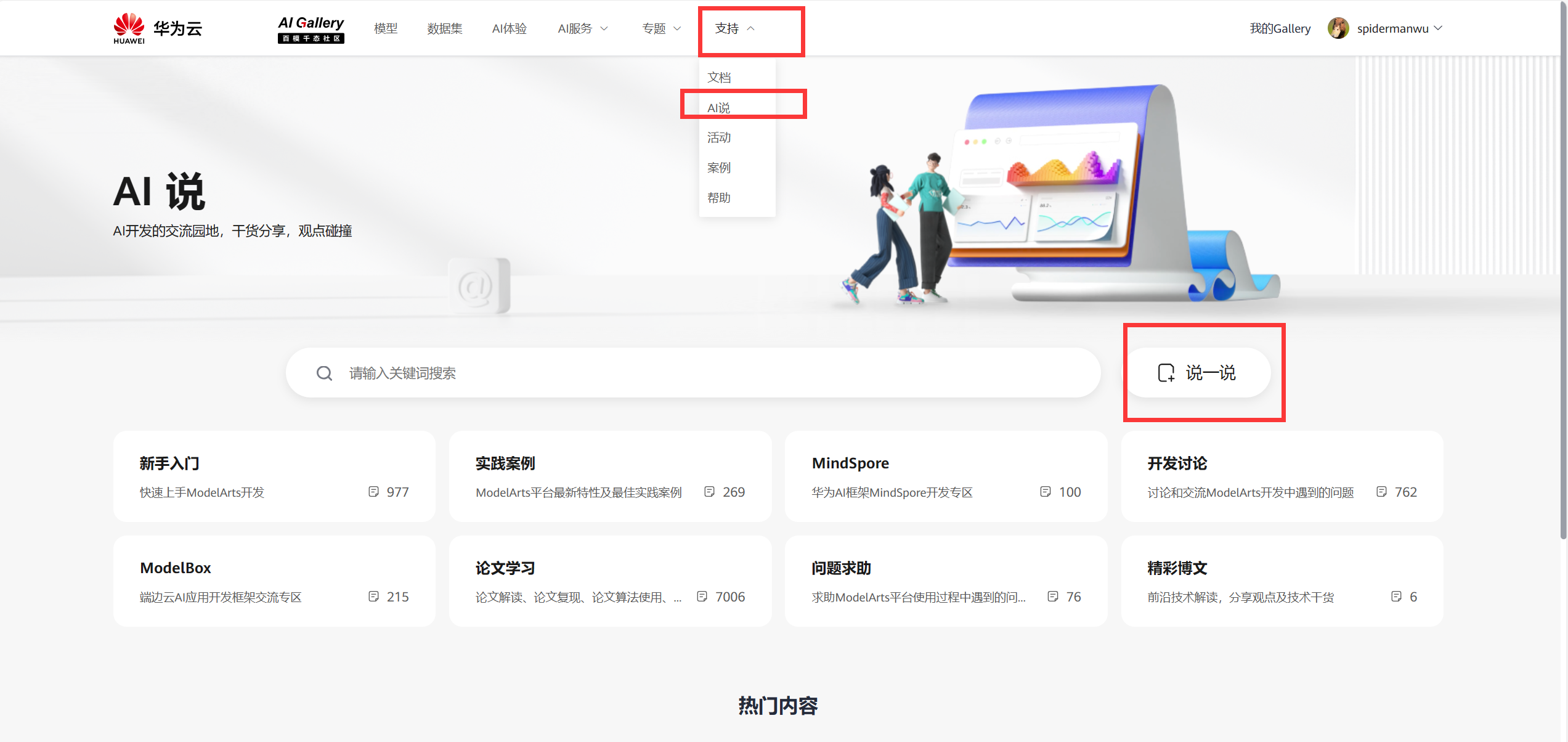 进入AIGallery>点击支持> AI说>填写标题对应的领域、摘要、内容即可完成发布( 上传图片时请选择本地上传)