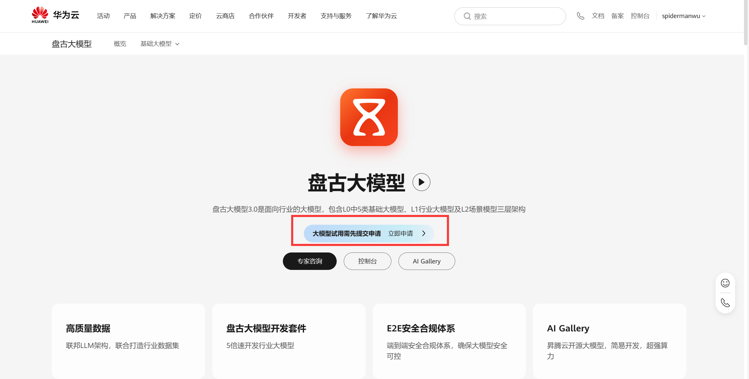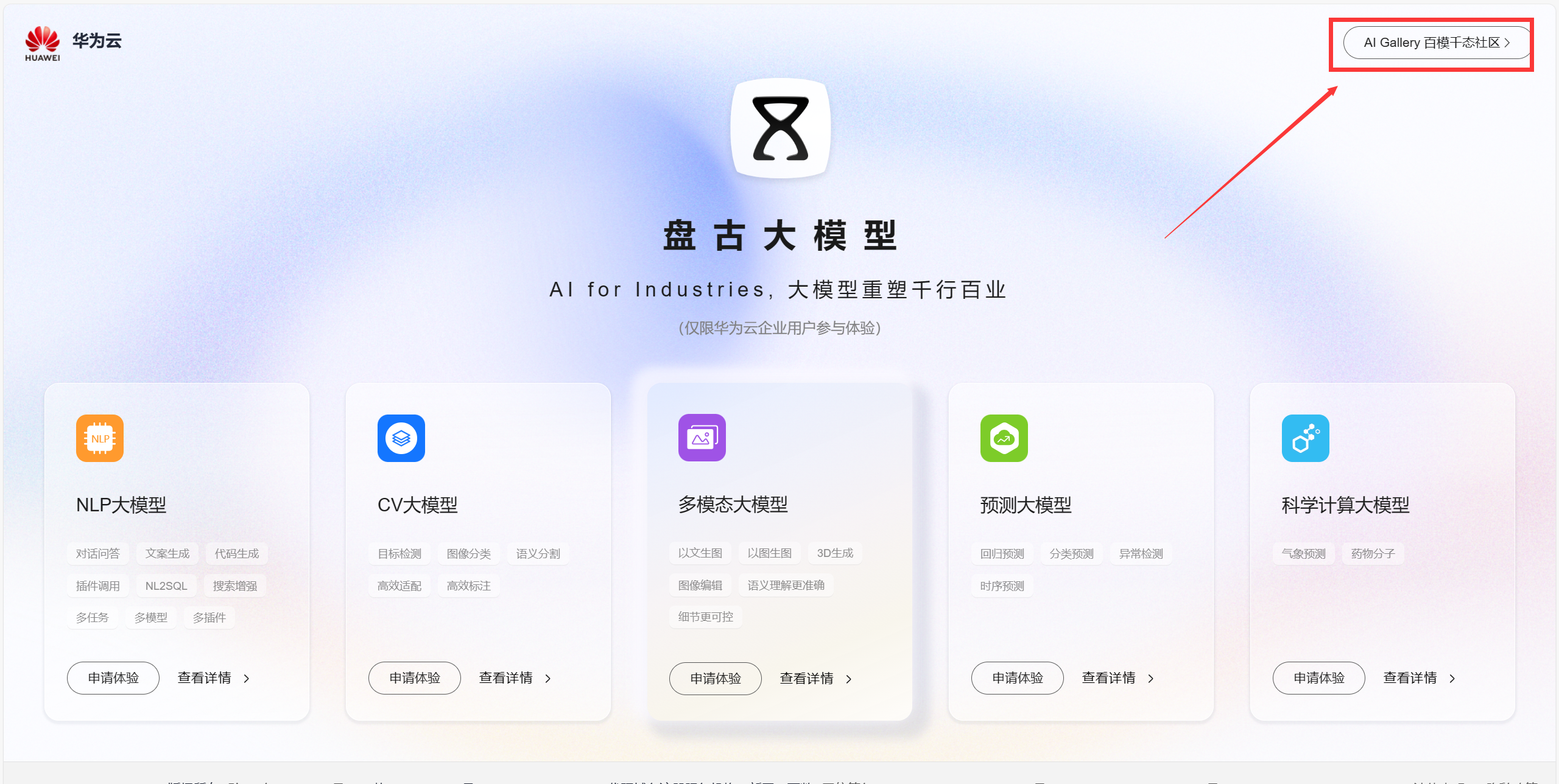 ●方式1:进入华为云>点击产品栏目>点击右侧人工智能>盘古大模型PanguLargeModels>点击立即申请>进入盘古大模型官网>点击右上角AIGallery百模千态社区