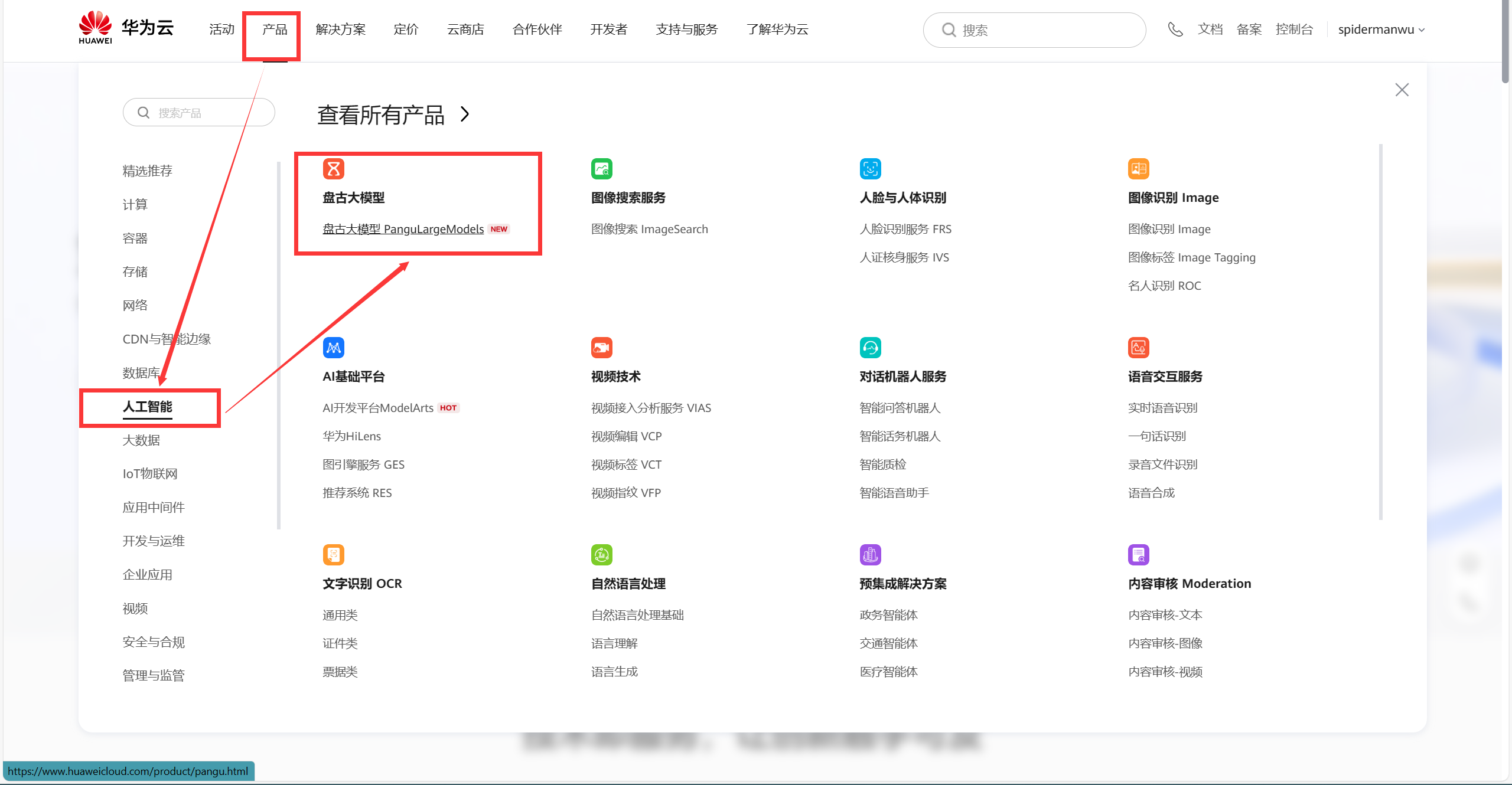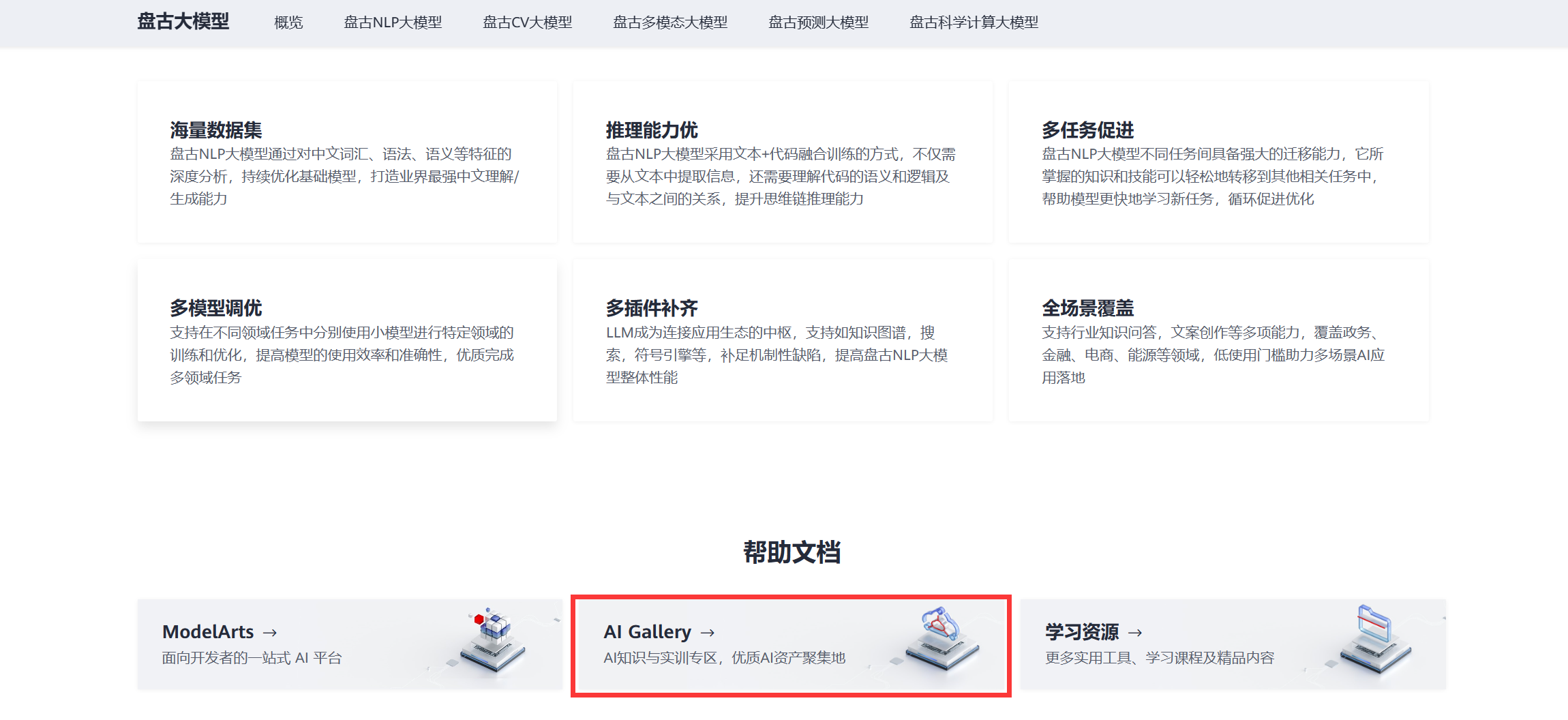 ●方式3:进入华为云>点击产品栏目>点击右侧人工智能>盘古大模型PanguLargeModels>点击概览、盘古CV大模型、盘古多模态大模型、盘古预测大模型、盘古科学计算大模型>下拉页面至底部>点击文档与学习成长/帮助文档>点击AIGallery百模千态社区