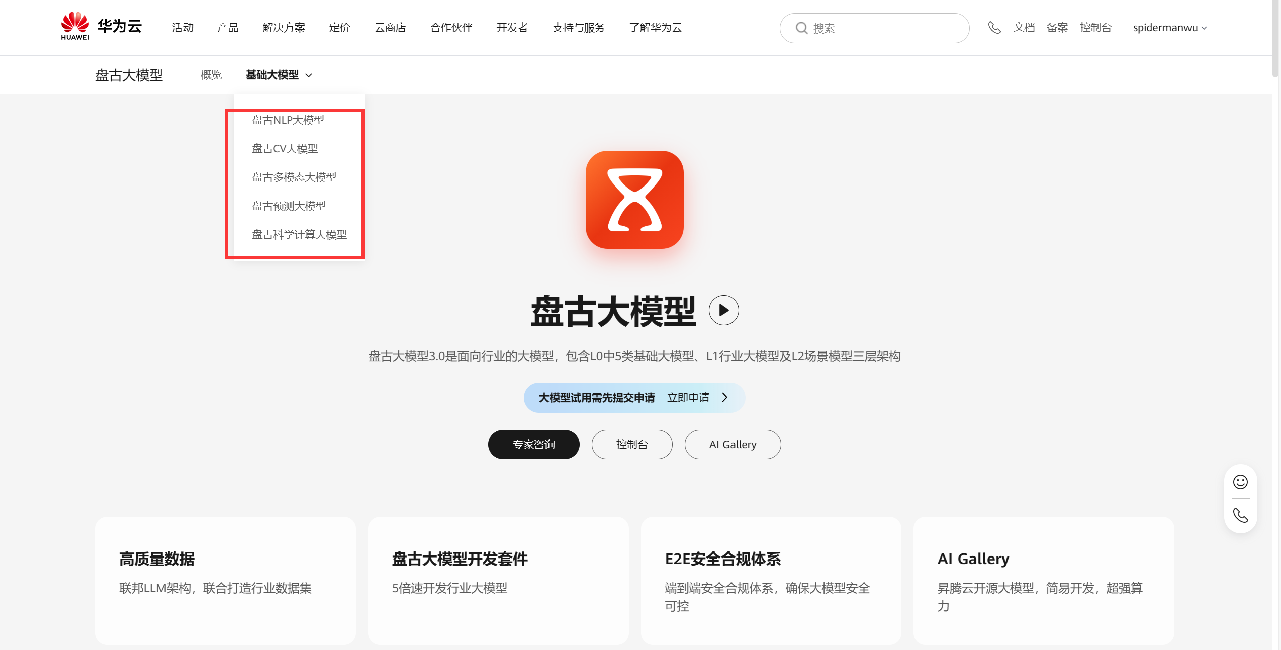 ●方式2:搜索盘古官网网址( https://pangu.huaweicloud.cn) 点击右.上角AlGallery百模千态社区