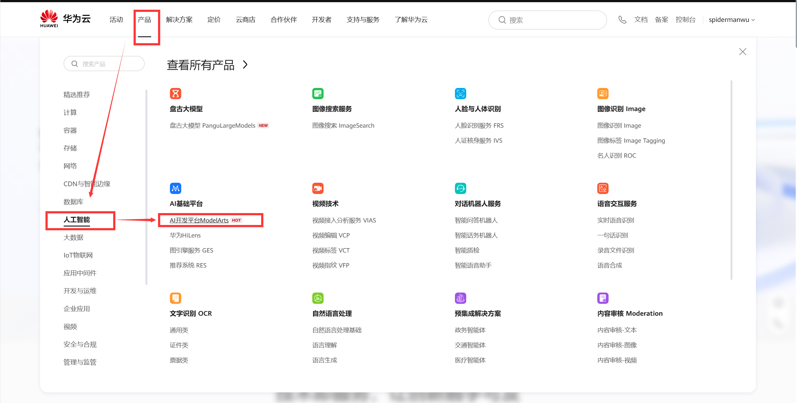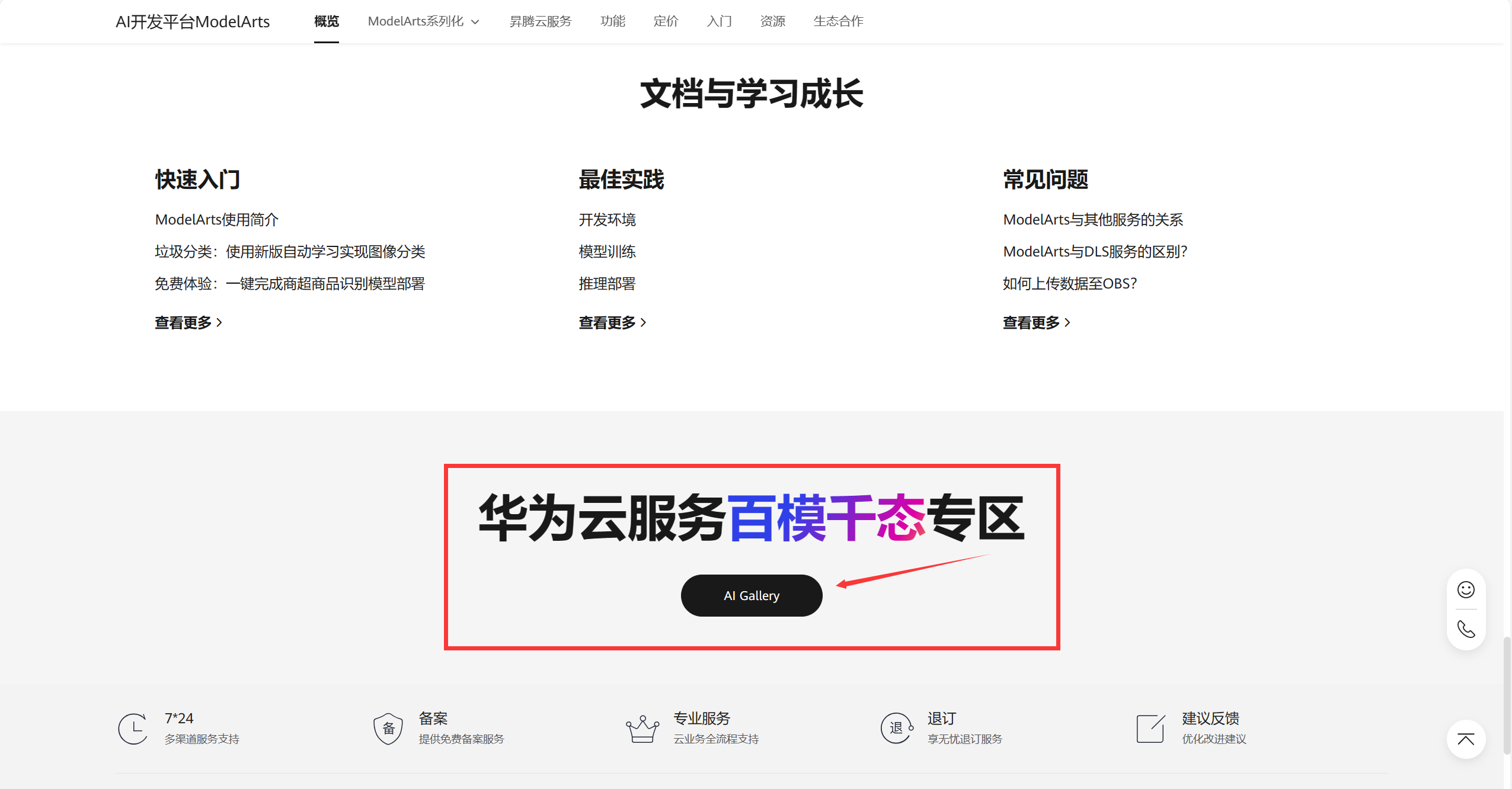 ●方式4:进入华为云>点击产品栏目>点击右侧人工智能>点击AI开发平台Modelarts进入详情页面>下拉页面至底部>点击AlGallery百模千态社区