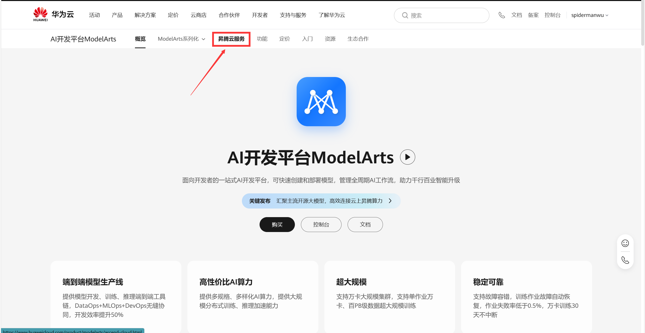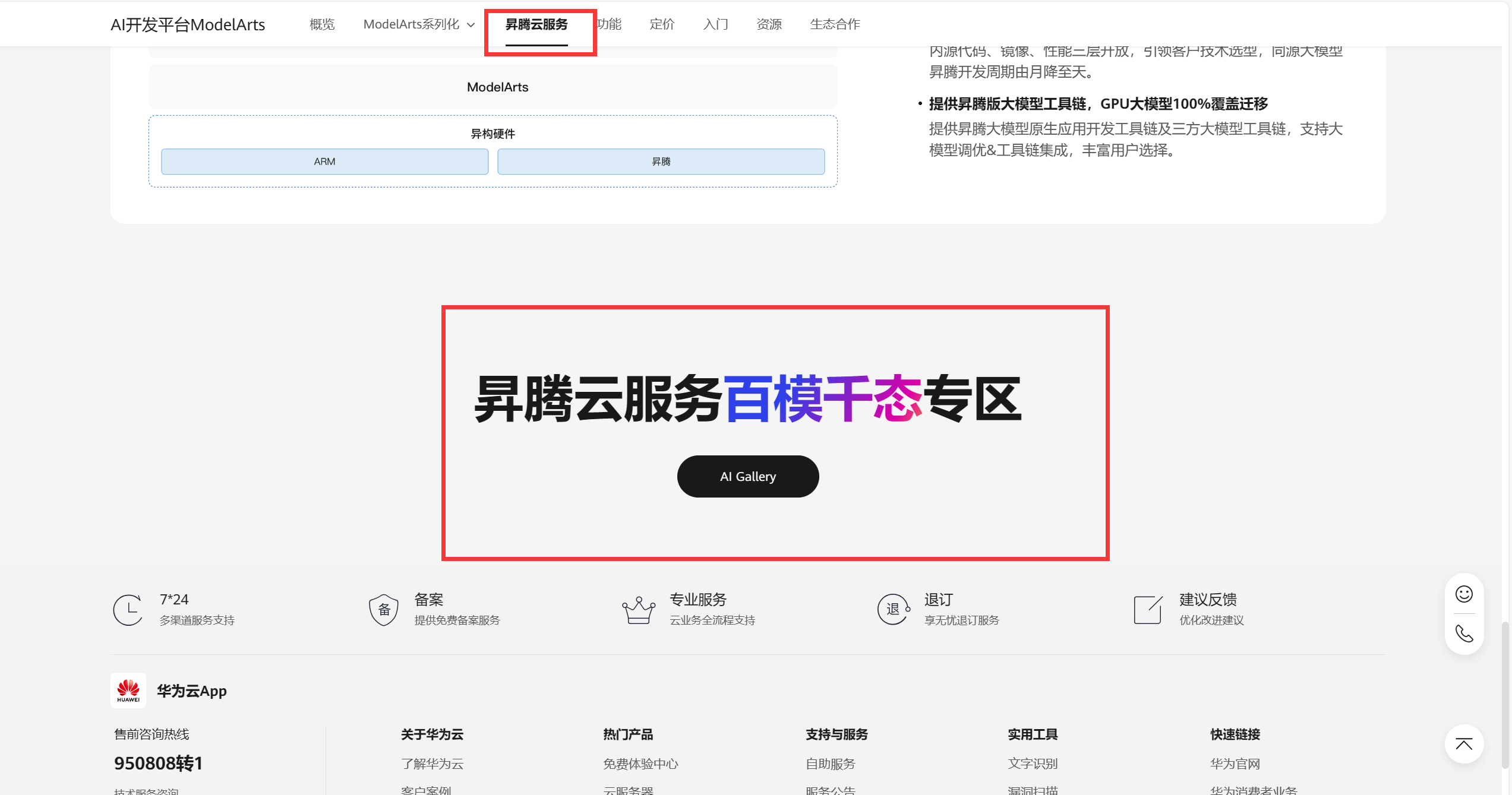 ●方式5:进入华为云>点击产品栏目>点击右侧人工智能>点击AI开发平台Modelarts进入详情页面>点击异腾云服务>下拉页面至底部>点击AIGallery百模千态社区