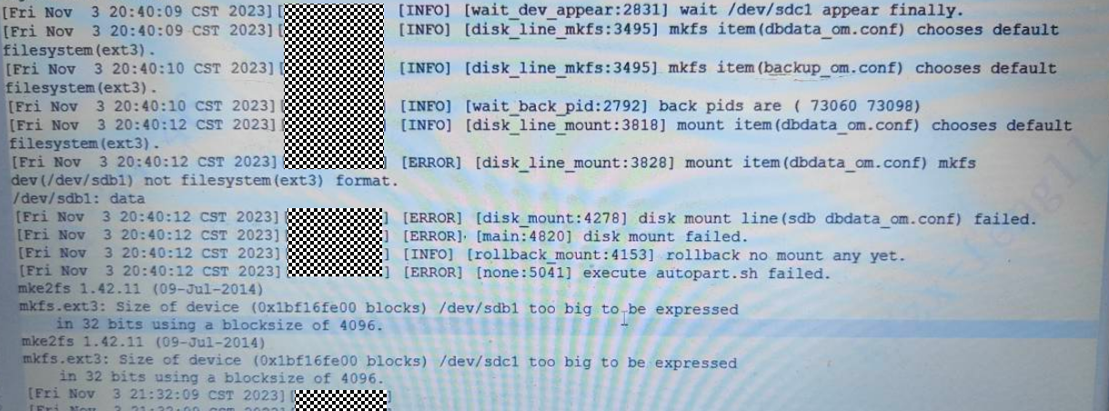 问题分析:报错格式化磁盘失败,磁盘大小超过ext3的限制,格式化磁盘时会将数据盘自动格式化为OS盘的格式,如:OS盘为ext4,则数据盘就会被格式化为ext4;