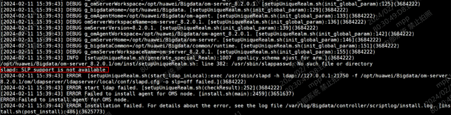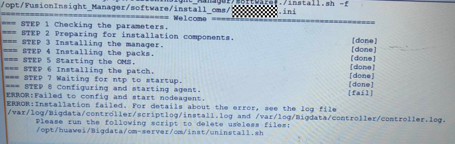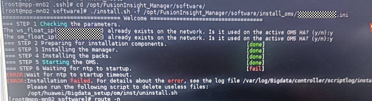 问题分析:日志中显示执行su - omm ssh $floatip xxxx命令报错permission deny,互信异常导致;补充iputil和openldap包后重新安装仍旧失败,继续分析ha日志(/var/log/Bigdata/omm/oms/ha/runlog/ha.log),ha日志中有opendir failed报错,/srv/BigData/LocalBackup目录下有文件残留导致