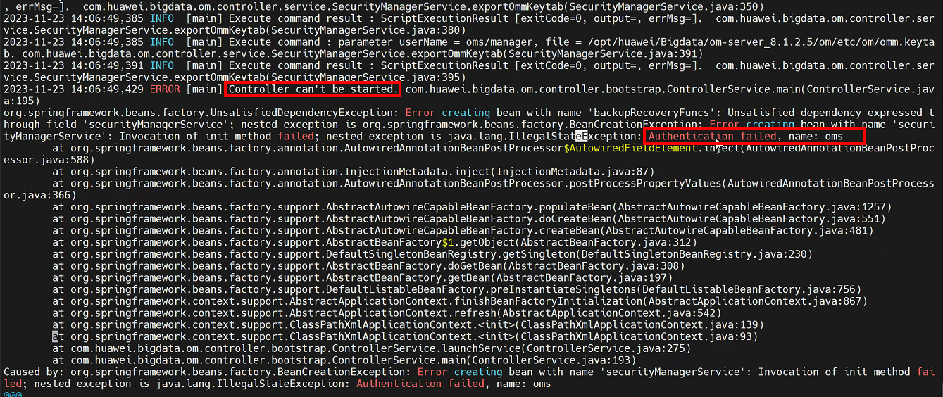现场安装时多次安装卸载,停止一个oms后发现controller状态异常,查看controller日志(/var/log/Bigdata/controller/controller.log),日志中报错controller cannot be started ,authentication failed;