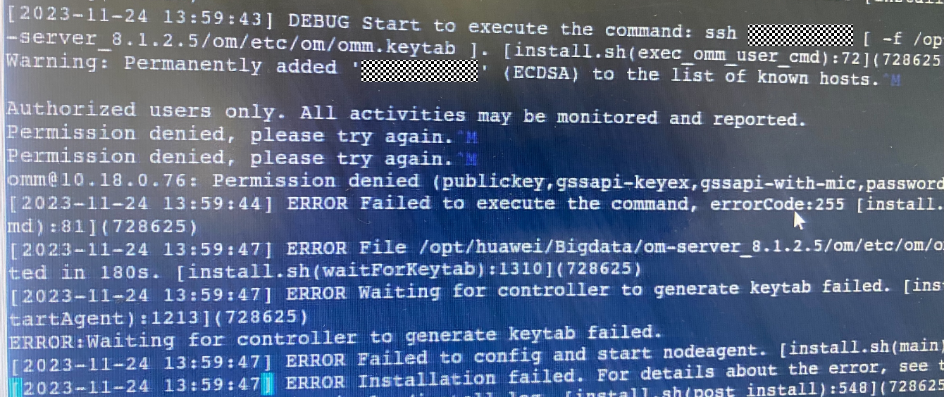 问题分析:查看install.log报错启动ntp超时,查看installntp.log(/var/log/Bigdata/nodeagent/scriptlog/installntp.log)显示安装ntp成功;继续排查ha_ntp.log(/var/log/Bigdata/omm/oms/ha/scriptlog/ha_ntp.log)发现从浮动ip拷贝ntpkeyfile失败,检查omm互信发现互信异常,主备oms互信异常,继续排查ha日志,备oms节点ha日志报错无法访问/srv/BigData/LocalBackup目录,排查发现此目录权限异常