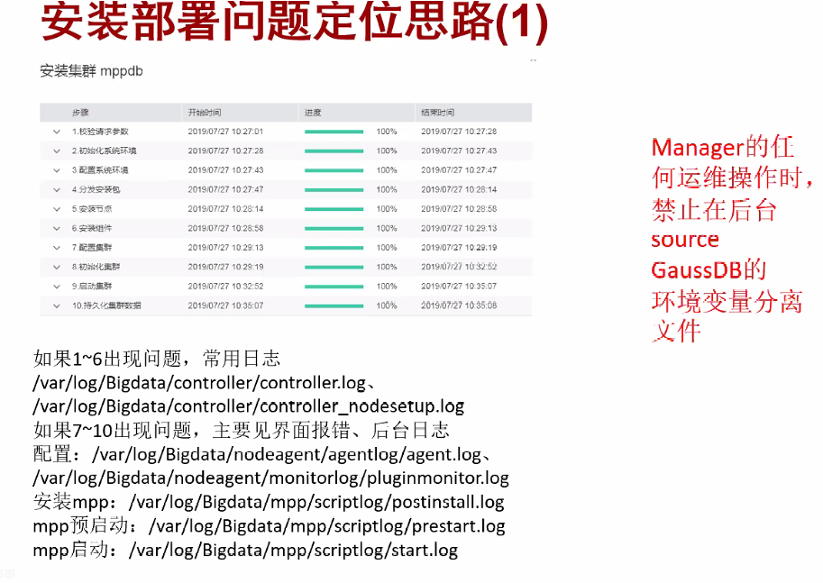 继续排查gs_install日志(/var/log/Bigdata/mpp/omm/om/gs_install*.log),发现gs_install执行成功,怀疑是环境问题导致返回值异常