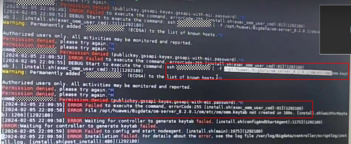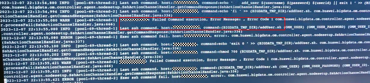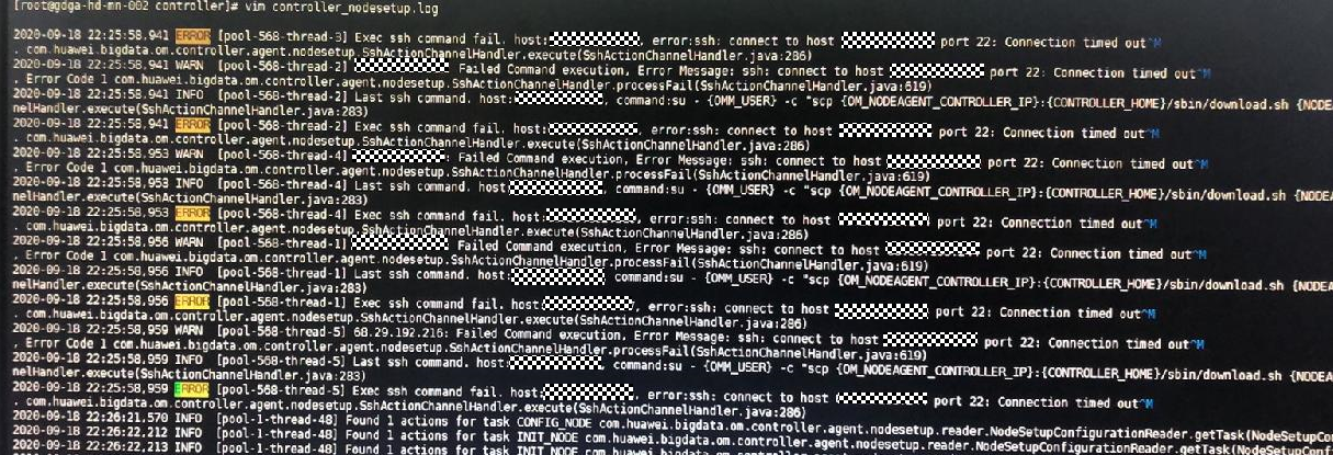 1. 查看controller_nodesetup.log日志(/var/log/Bigdata/controller/controller_nodesetup.log),日志报错执行ssh命令失败,手动使用omm用户测试ssh,ssh直接失败