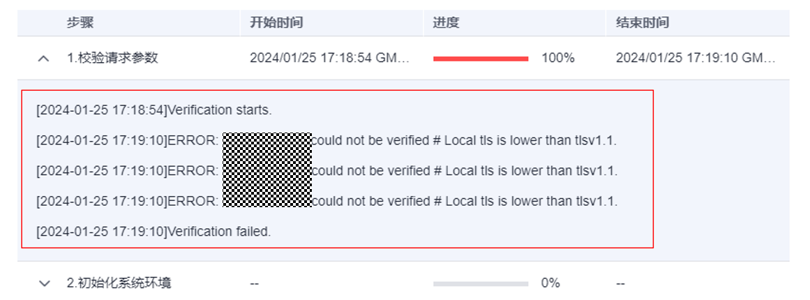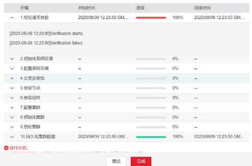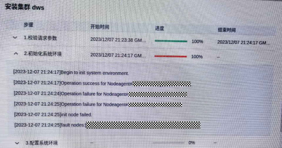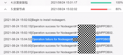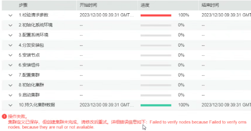 1. 此步骤报错一般是nodeagent进程异常导致,检查主备oms节点nodeagent进程,发现进程正常且未发生重启,尝试重试,多次重试仍旧报错而且不走进度条直接报红秒报错