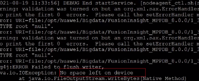 问题分析:查看/var/log/Bigdata/nodeagent/scriptlog/install.log,报错 no space left on device