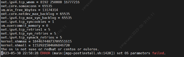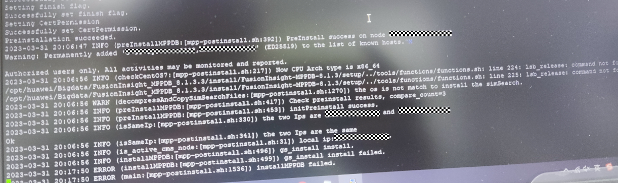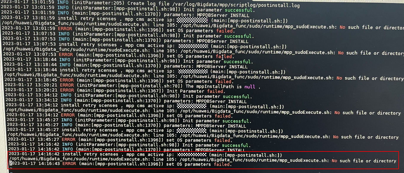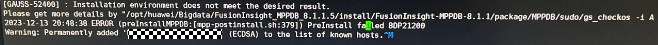 问题分析:查看第一个数据节点的postinstall日志(/var/log/Bigdata/mpp/scriptlog/postinstall.log),有个节点内核前置preinstall失败,查看失败节点的postinstall日志(/var/log/Bigdata/mpp/scriptlog/postinstall.log),报错gs_checkos -i A检查不通过,按照报错提示执行gs_checkos -i A检查,将A改为B执行修复后重试,安装成功
