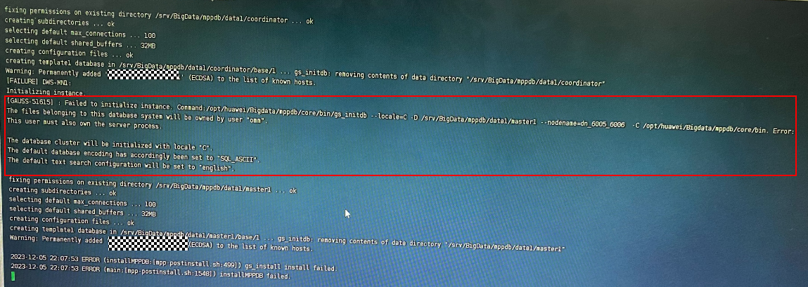 问题分析:查看第一个数据节点的postinstall日志(/var/log/Bigdata/mpp/scriptlog/postinstall.log),发现执行到gs_install失败,日志报错如下:gs_initdb执行失败