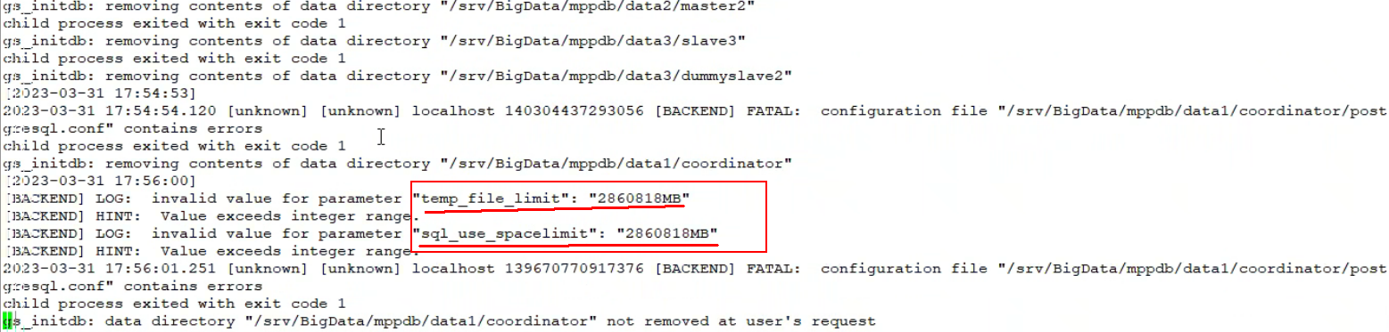 继续查看gs_initdb日志(/var/log/Bigdata/mpp/omm/bin/gs_initdb/gs_initdb.log),日志报错tmp_file_limit和sql_use_spacelimit参数超限,此参数取值为数据盘大小的10%,数据盘大于20T导致