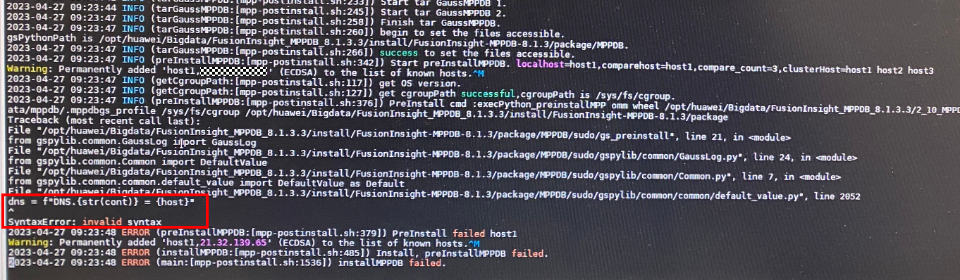 查看第一个数据节点的postinstall日志(/var/log/Bigdata/mpp/scriptlog/postinstall.log),日志报错执行python脚本时语法错误,查看python3版本为3.4.10,python3版本过低语法不兼容导致,python3版本不能低于3.7