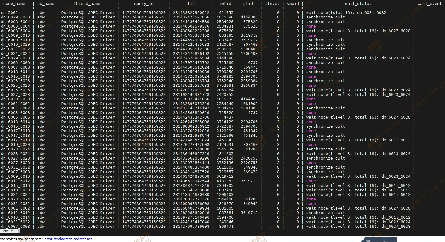 【摘要】 查询活跃会话定位到存储过程select * from pgxc_stat_activity where state = 'active' and query like '%%' and usename not in ('omm', 'Ruby');2.根据queryid查询等待视图select * from pgxc_thread_wait_status where query_id=xxx...