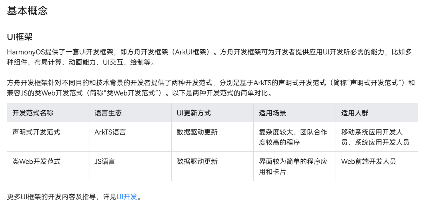 这里的UI开发框架称为:方舟开发框架(ArkUI框架),同样提供了 UI 所须要的:基本组件、布局计算、动画能力、UI交互、绘制等。