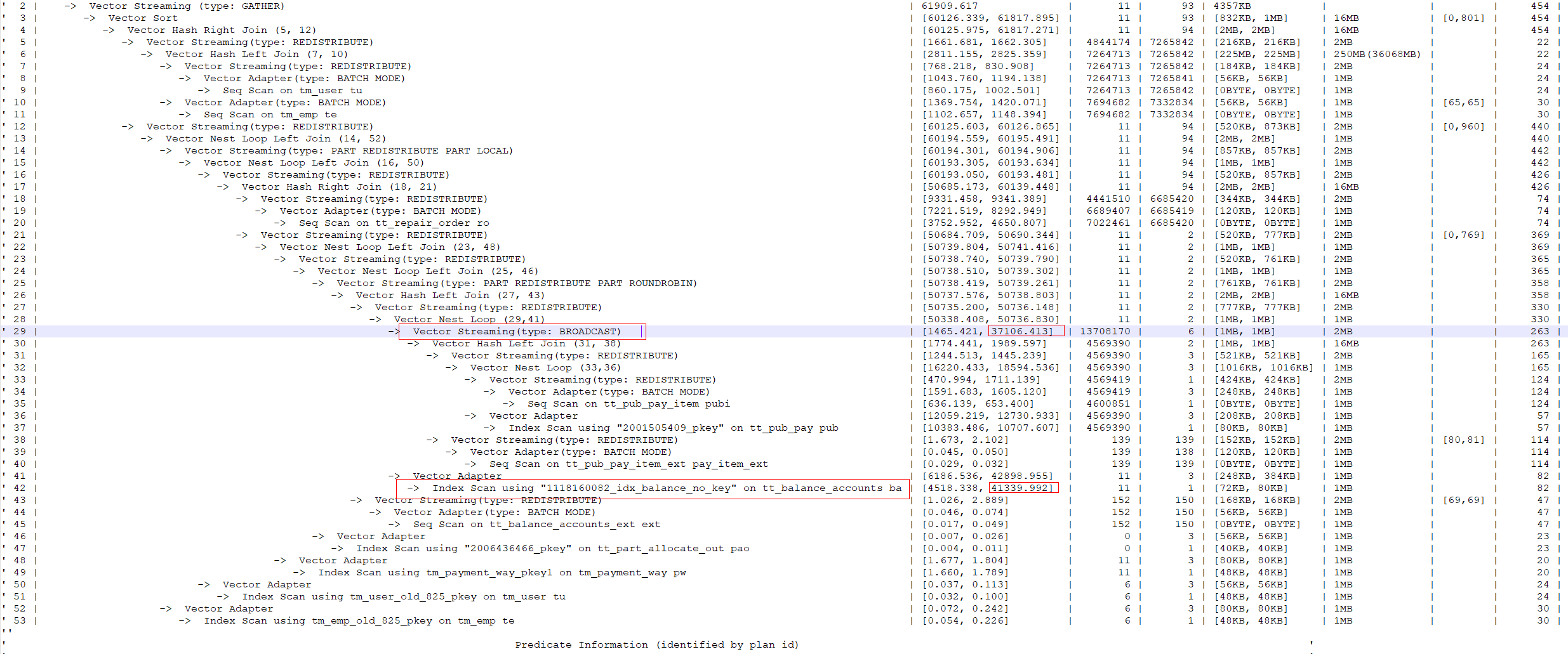 - 修改分布列为’BALANCE_NO‘,该SQL的执行时间由62s优化到25s。