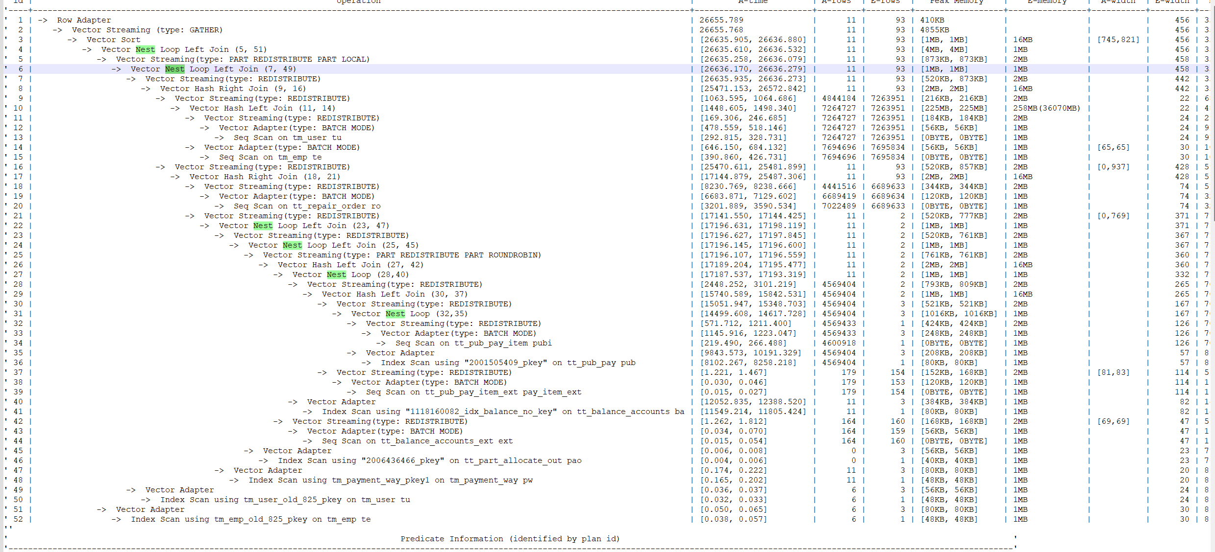 - 重新打执行计划,观察到瓶颈点主要在nestloop算子。设置hint参数 enable_index_nestloop = off; 后。SQL的执行时间优化到11s。