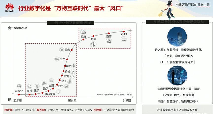 由于行业数字化发展,将来会有千亿端侧设备进行互联。涉及行业包括政府、金融、通信、OTT、零售、汽车、电力等。在终端设备互联方面,包括进入核心作业系统,端侧装备数字化,如金融移动展业服务、OTT新型智能家居家庭网关;从单场景到全场景业务协同、联动,政府行业如燃气、智能管廊,能源行业如智慧煤矿、智能电力等。