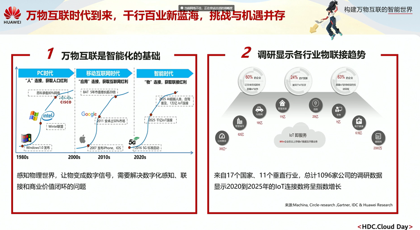 从PC时代的“人”连接,到移动互联网时代的“应用”连接,再到即将发展到的智能化时代的“物”连接。感知物理世界,让物变成数字信号,需要解决数字化感知、联接和商业价值闭环的问题。