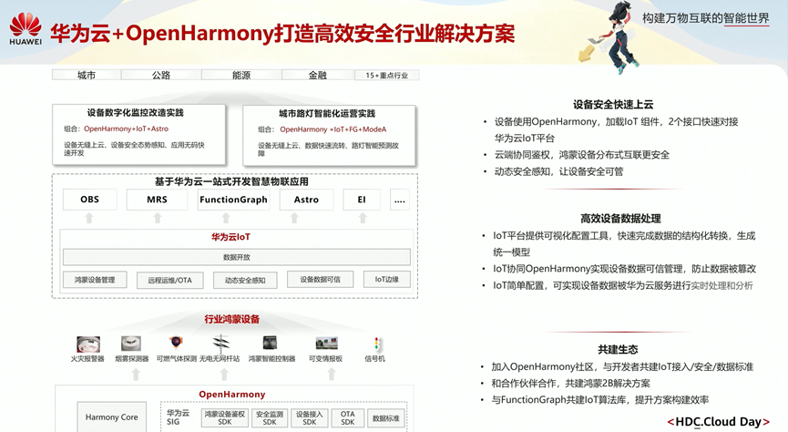 华为云通过与OpenHarmony相结合,已打造一些高效、安全行业解决方案。如通过OpenHarmony与loT、Astro相结合,打造了设备数字化监控改造实践,实现了设备无缝上云、设备安全态势感知、应用无码快速开发,OpenHarmony、loT、FG、ModeA相结合,打造了城市路灯智能化运营实践,实现了设备无缝上云、数据快速流转、路灯智能预测故障等功能。