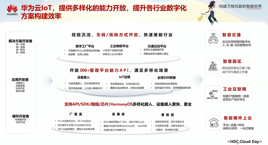 华为云loT目前已支持API、SDK、模组、芯片、HarmonyOS多样化投入、设备接入更快、更全,具备广覆盖、高兼容、更智能特点。现已开放300+管理平台能力API,满足多样化场景。