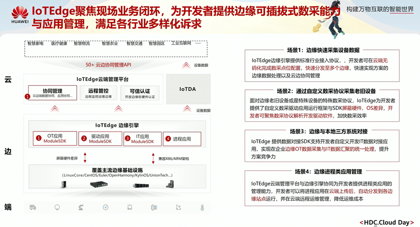loTEdge聚焦现场业务闭环,为开发者提供边缘可插拔式数能力与应用管理,满足各行业多样化诉求。loTEdge通过端边云协同,目前已应用于智慧家电、医疗健康、智慧物流、智慧农业、智慧交通、智慧园区、工业互联网等行业中。