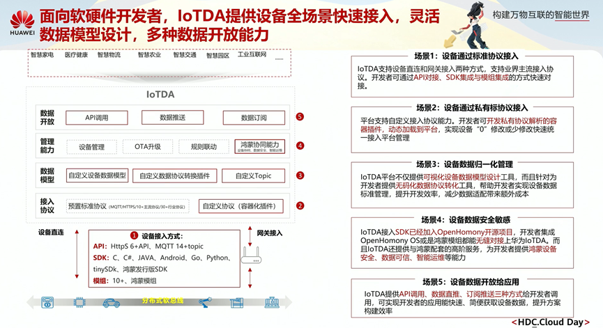 面向软硬件开发者,loTDA提供设备全场景快速接入,灵活数据模型设计、多种数据开放能力。