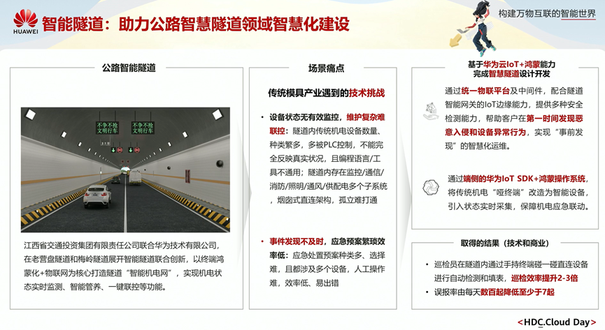 在智能隧道场景下,通过loT与鸿蒙相结合,以终端鸿蒙化+物联网为核心打造隧道“智能机电网”,实现机电状态实时监测、智能管养、一键联控等功能。使得巡检员巡检效率提升2-3倍,误报率由每天数百起降低至少于7起。