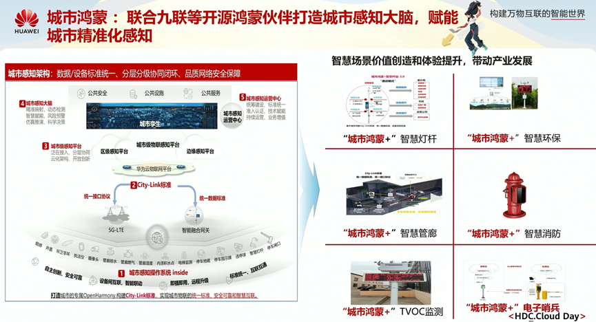 在智慧城市场景下,通过loT与鸿蒙相结合,打造城市感知大脑,赋能城市精准化感知。应用场景如智慧灯杆、智慧环保、智慧管廊、智慧消防等,通过智慧场景价值创造和体验提升,带动产业发展。