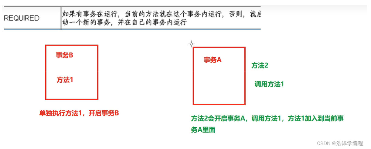 | REQUIRED | 如果有事务在运行,当前的方法就在这个事务内运行,否则,就启动一个新的事务,并在自己的事务内运行 |