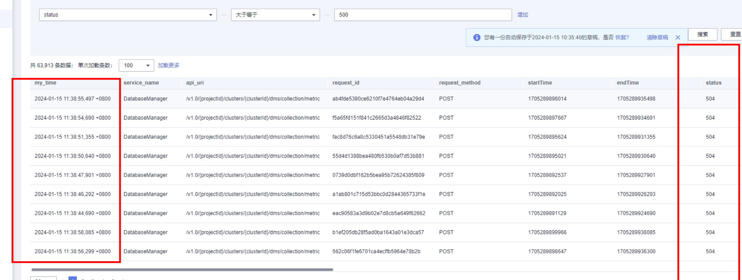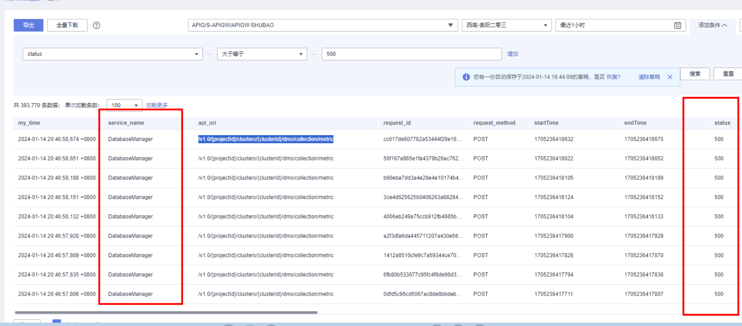 1、告警提示数据采集接口/v1.0/{projectId}/clusters/{clusterId}/dms/collection/metric成功率降低,查看网关发现很多接口报500错误码