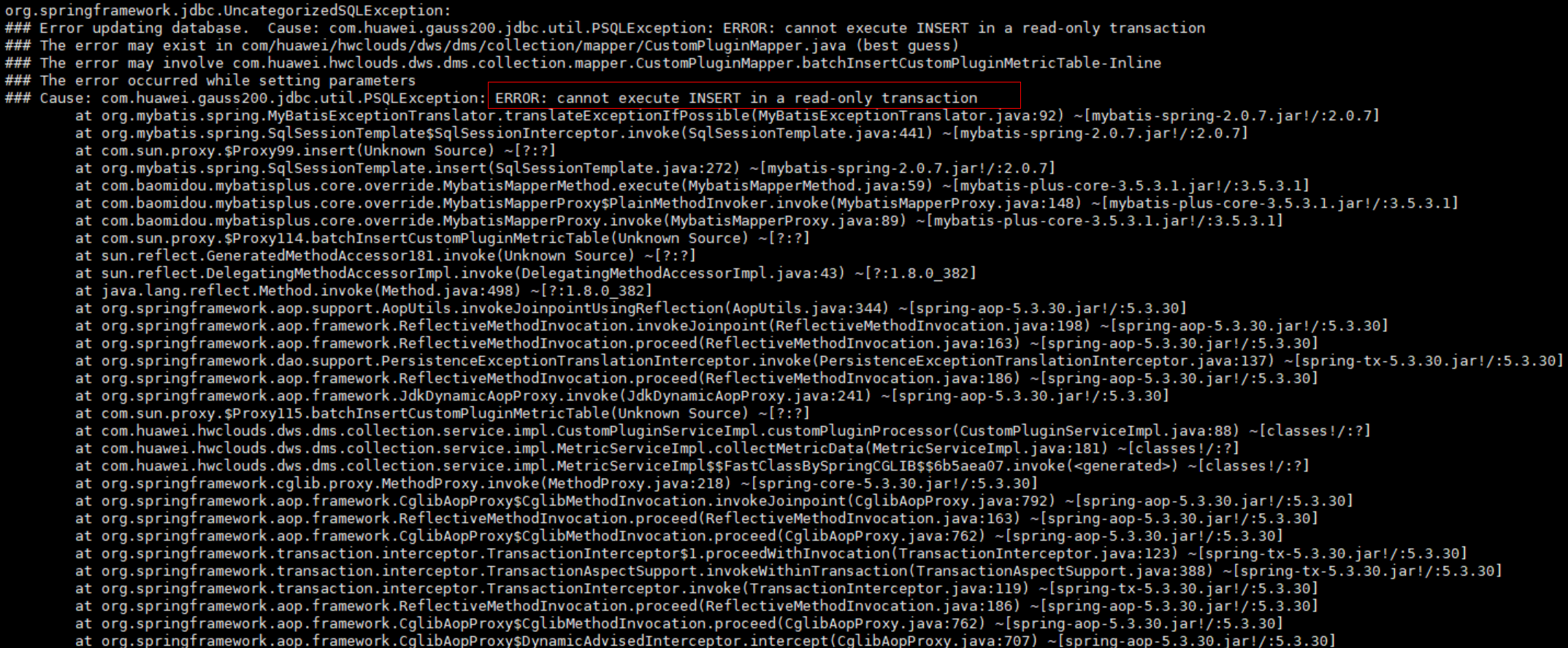 2、查看服务日志发现插入数据失败,提示集群处于可读状态