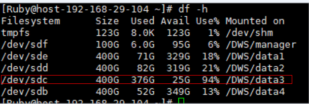3、查看系统磁盘,发现个别磁盘使用率超过90%,导致集群计入只读状态
