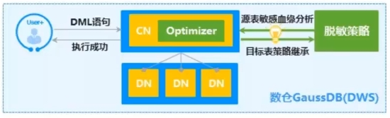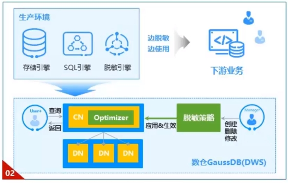 - DWS 则是基于数仓底座与存储引擎、SQL引擎直接交互的脱敏引擎,在查询执行过程中实时脱敏、脱敏结果直接返回给客户。