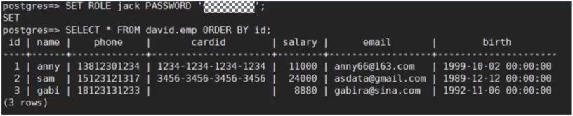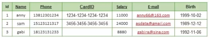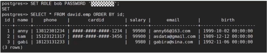 以员工表为例,表emp包含员工的姓名、手机号、邮箱、银行卡号、薪资等隐私数据。