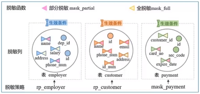 脱敏策略:刻画什么条件(生效条件)下哪些表对象的那些列(脱敏列)呈现什么样的脱敏效果(脱敏函数)。