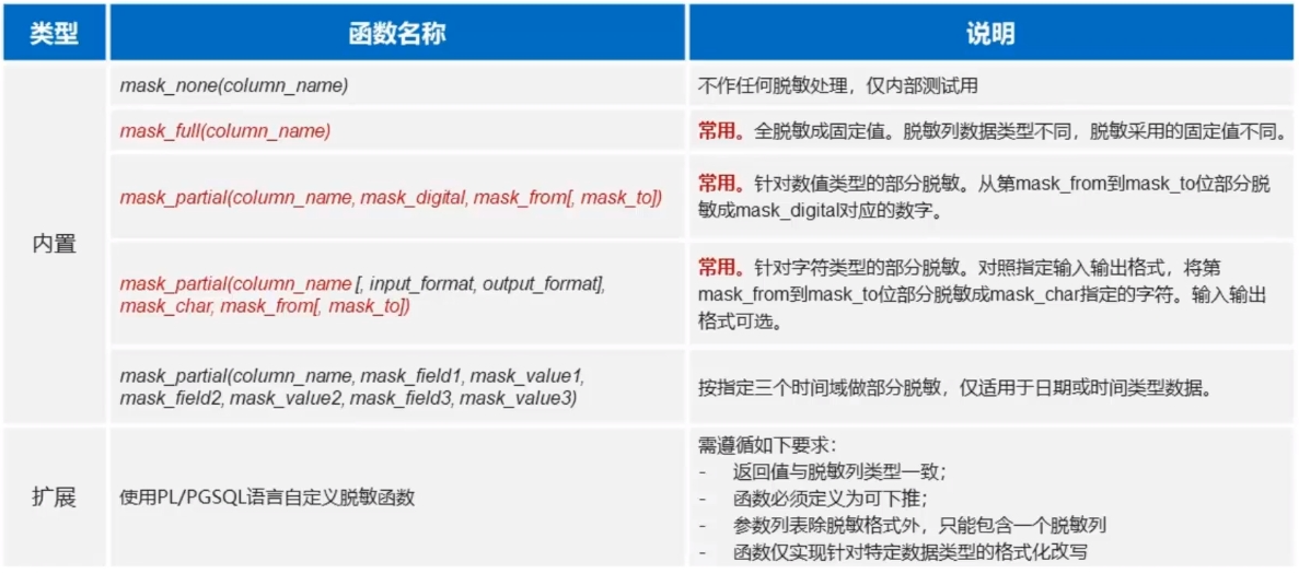 - 特别地,针对 length、count 等函数表达式计算结果不会暴露任何原始数据特征及信息,故提供 ALTER FUNCTION ...[NOT] MASKED 语法,支持用户手动配置不脱敏函数白名单。