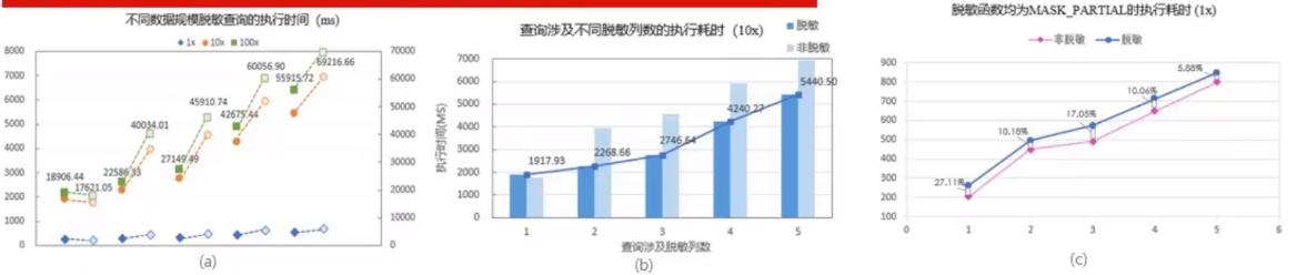 - 相同目标列数,且均采用相同脱敏函数情况下,带有脱敏的查询耗时比原始语句劣化10%,此劣化在可接受范围内。