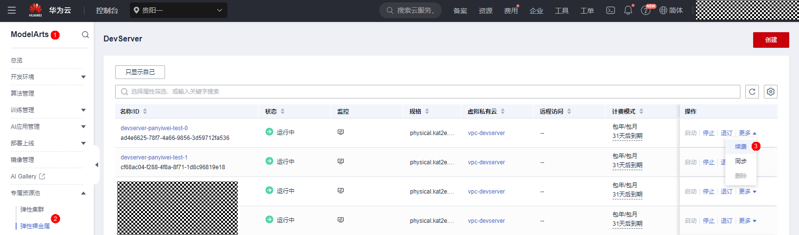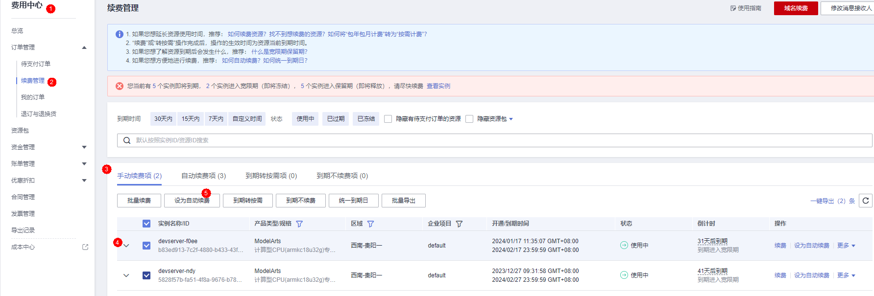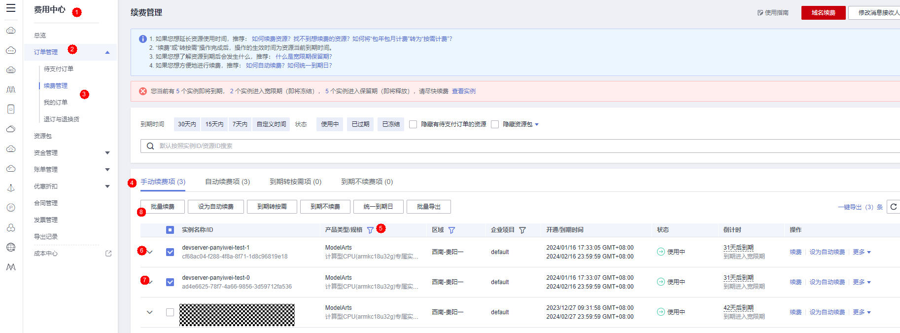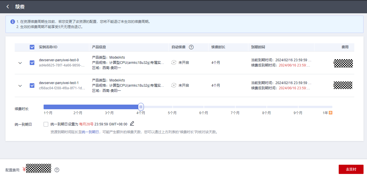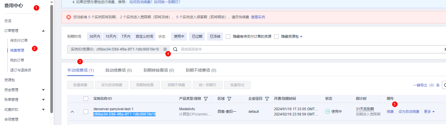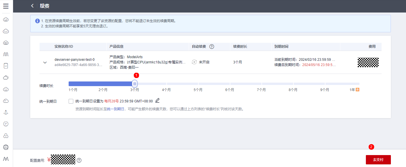 2. 方案一:直接在ModelArts Server中续费指定服务器资源