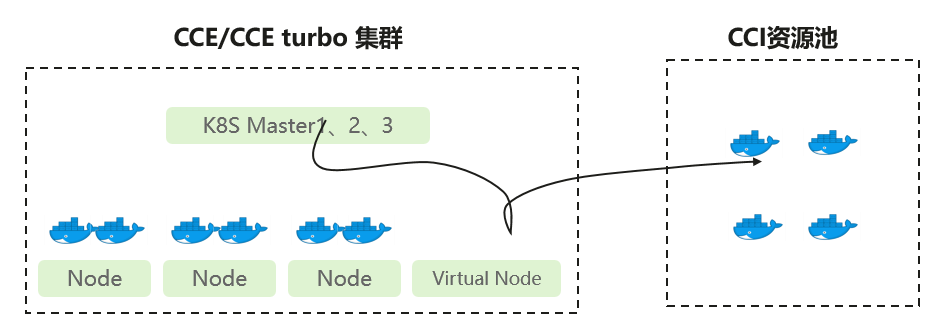 - 新pod创建时,如果CCE/CCE turbo集群有空闲资源,pod优先调度到CCE/CCE turbo上,如果集群没有可调度资源再通过vk部署到CCI上,调度到CCI的pod按秒计费,以更大限度提高固定成本的负载率;