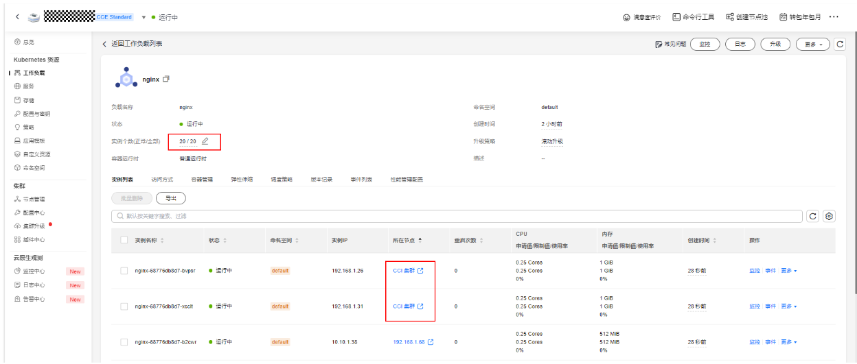 调整nginx的副本数到20,由于pod的request和集群节点资源情况,第19、20个pod由于本地没有资源才部署到CCI上,第1-18个pod本地有调度资源,优先调度运行在本地集群中。