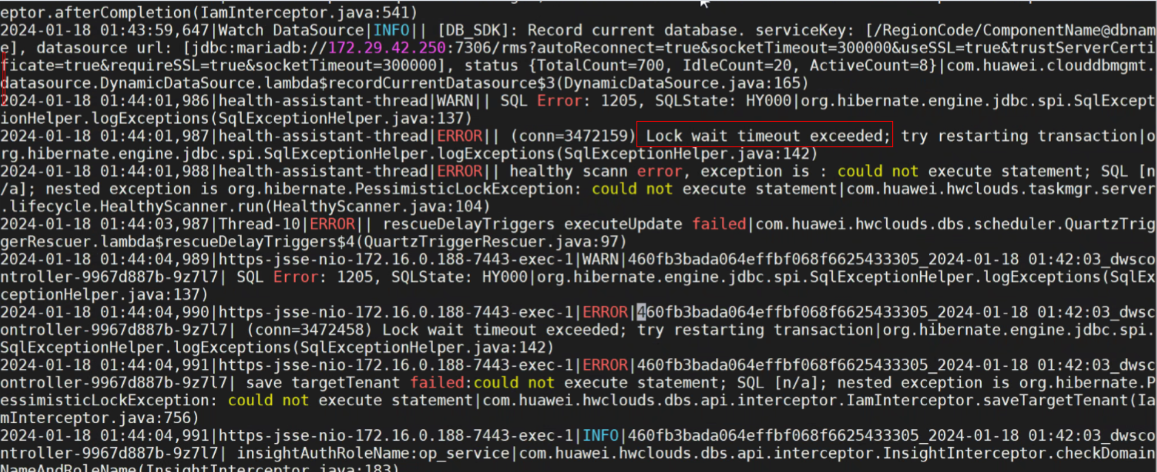 3、根据错误码查看是有长时间持有锁但未提交事务的进程导致(该步骤可跳过,root用户主库)