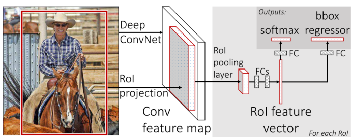 而 R-CNN 的检测速度很慢源于对于每一个建议对象都会执行ConvNet前向传播,而没有使用共享计算 ;