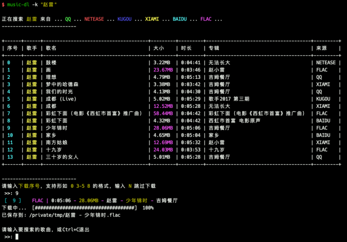 用户可以通过命令行输入关键字,Music-dl将在支持的网站上搜索匹配的音乐,并提供下载选项。例如: